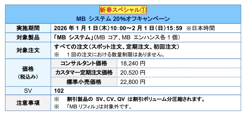 日頃のご支持への感謝の気持ちを込め、新年元旦(2026年1月1日)より1ヵ月、「MBシステム 20%オフキャンペーン」を実施いたします。